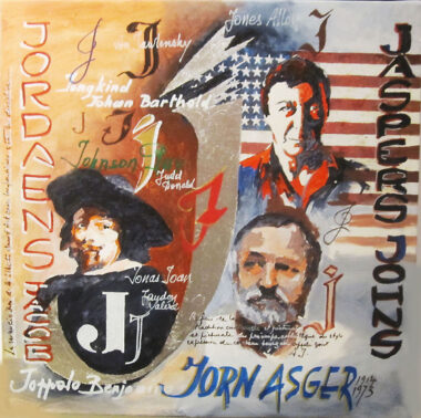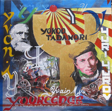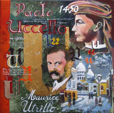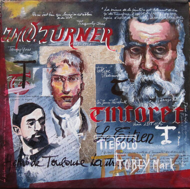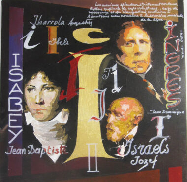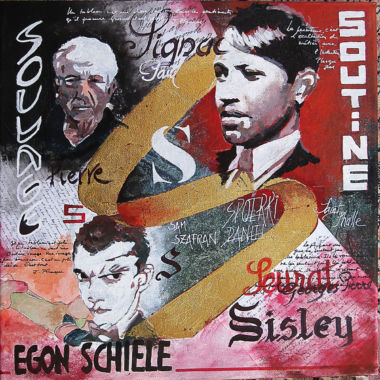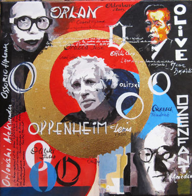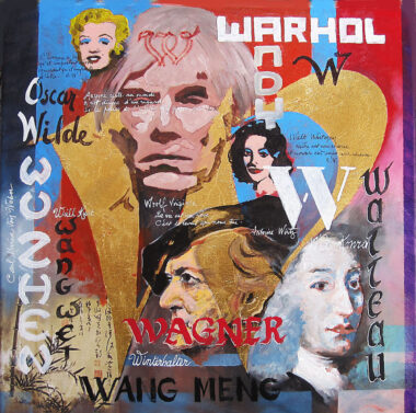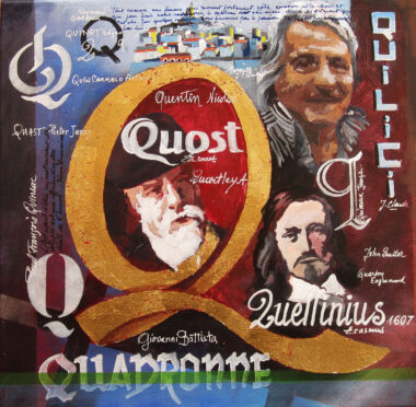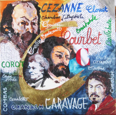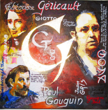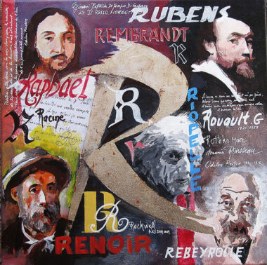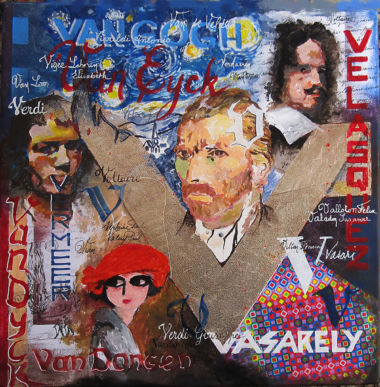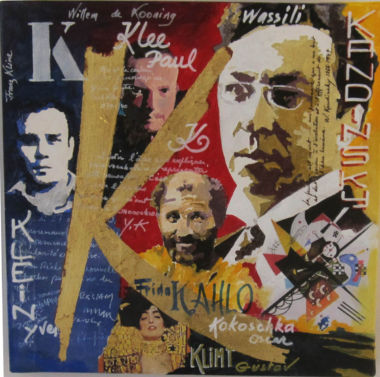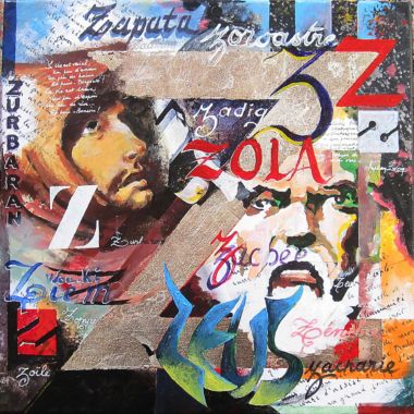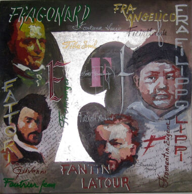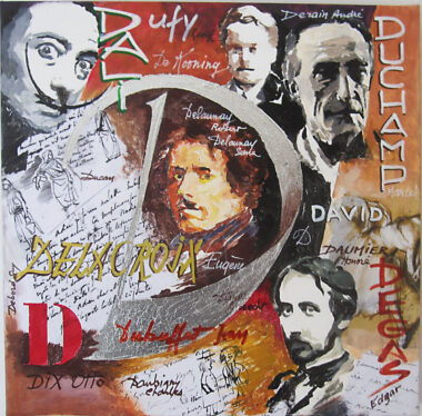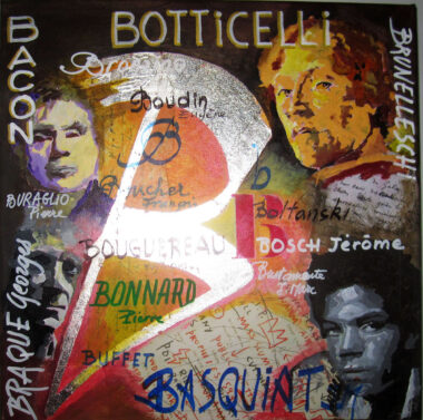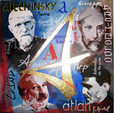 Chaque toile présente des visages, œuvres ou écrits d’artistes, peintres pour la plupart, dont le nom commence par la lettre qui y figure.